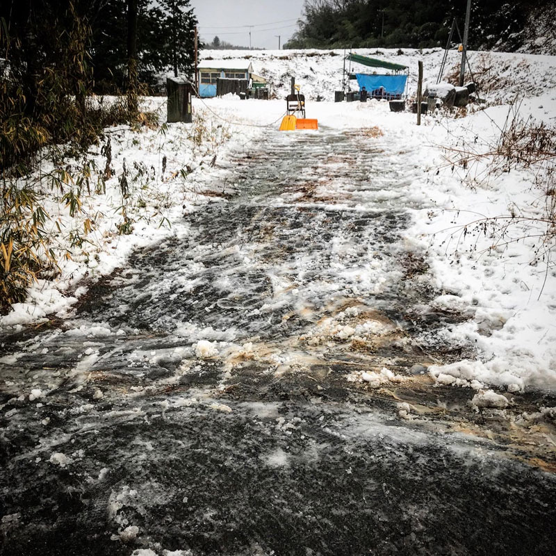 滑る滑る。辺り一面、仕事がはかどらないべちょべちょの重いシャーベット。でも入り口の雪かきやっておいたので明日でかい氷に阻まれて仕事場に入れなくなる事はない。