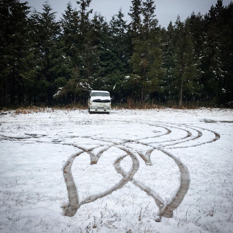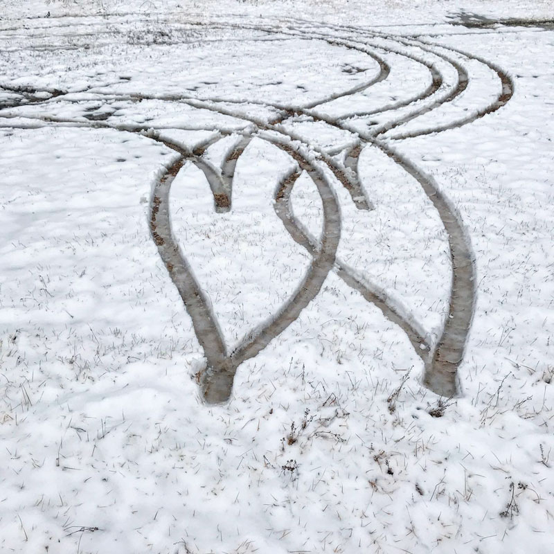 毎年恒例。車の轍で描いたダブルハート。