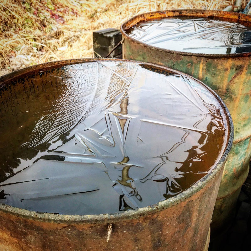 今朝は仕事場のドラム缶の水が薄く薄く凍ってた。