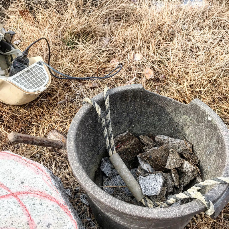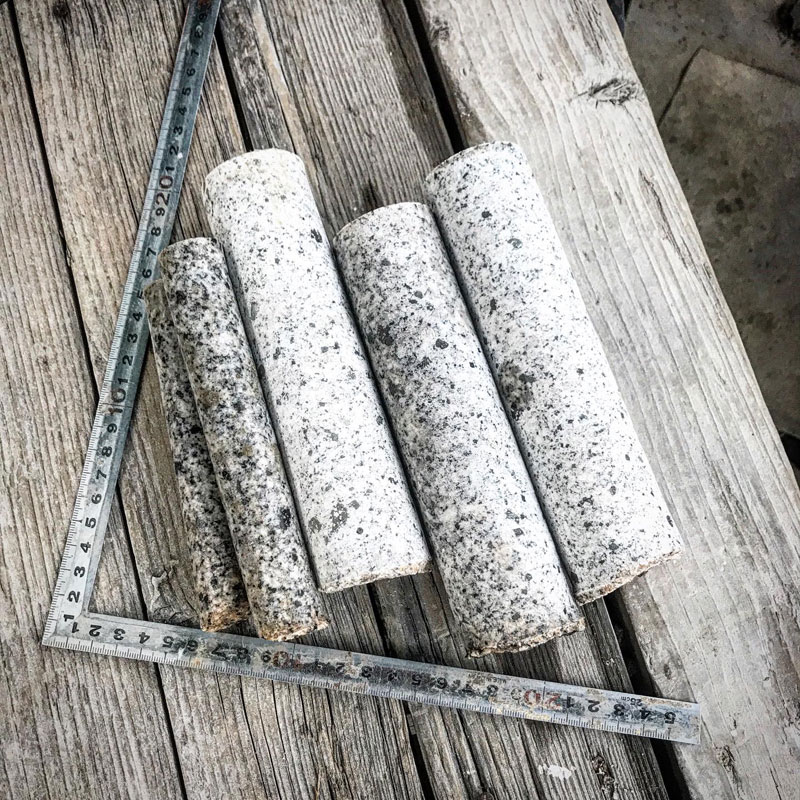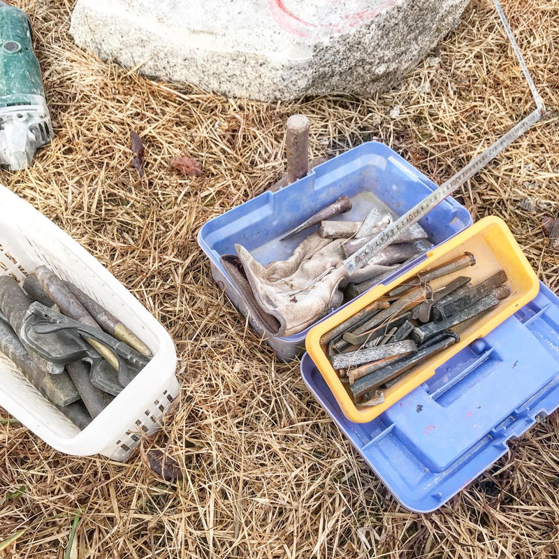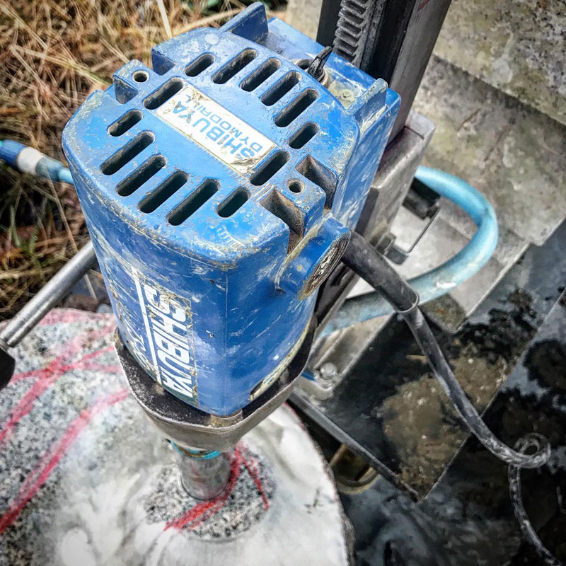 彫り始めた白御影石にコアドリルで穴をあけた。冬がやってきて水が凍りまくる前に。