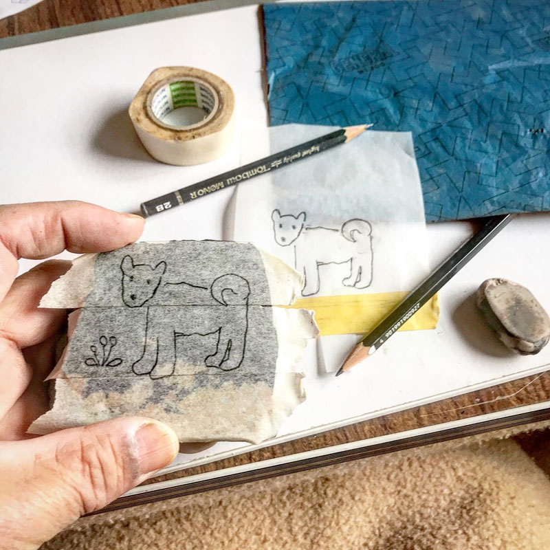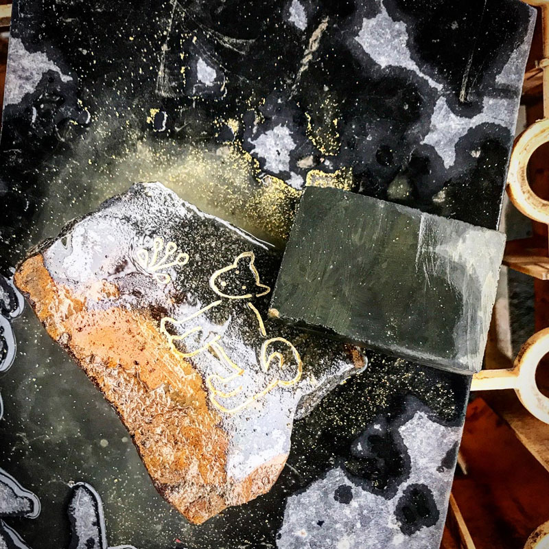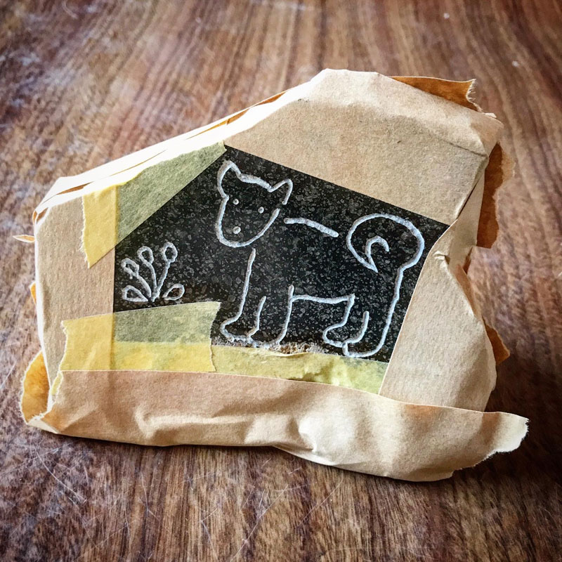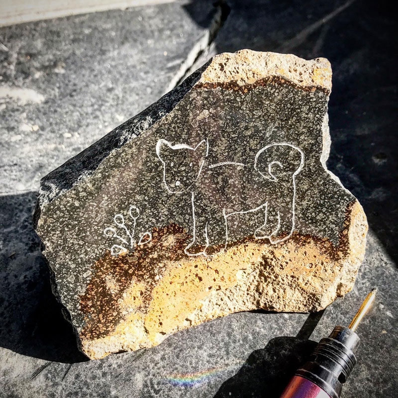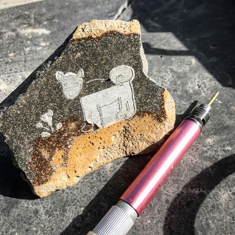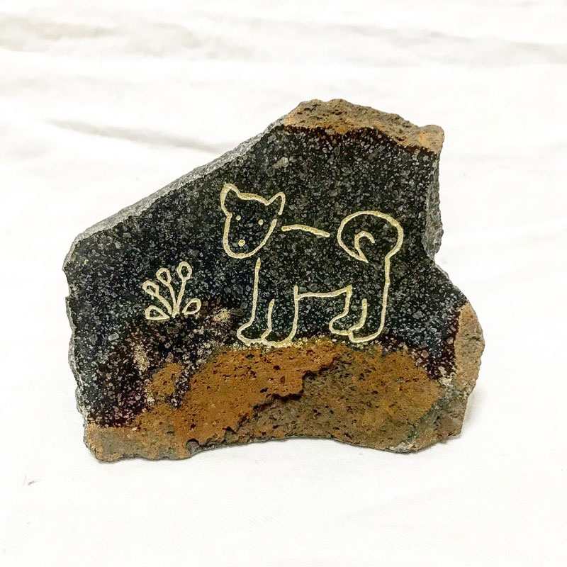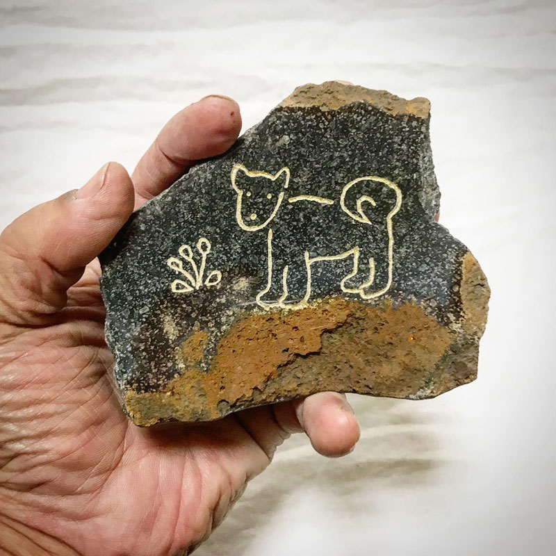 その後、それを欲しいという方が現れて話をしていたら、最近愛犬を亡くしたばかりで犬を彫った石を身近に置いて偲びたい、と言うのでその方の犬に寄せて耳を立てたり尾を巻いたりとデザインを変更して2パターン作った。伊達冠石の泥様部分を大地に見立てて残して磨いた石に下絵を写す。
