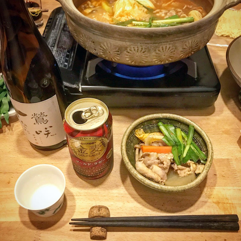 いただいた吟醸酒で乾杯して、赤い金麦。