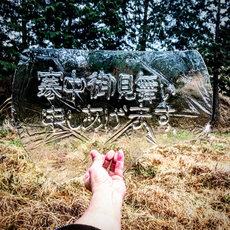 氷に書いてネットでご挨拶しようと思っていたんだけど今年は凍らない異常な冬でできなかった。今日、薄い氷でなんとかできた。