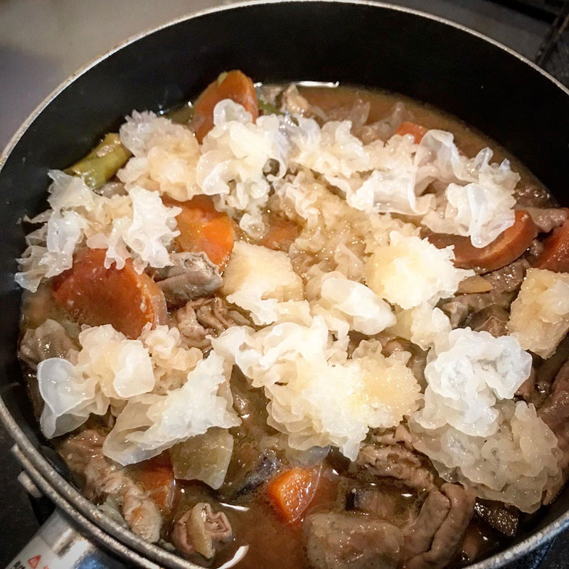 普通のキクラゲと違って白キクラゲは襞がすごいのでモツ煮に入れたら出汁を吸って美味しいはず!と。