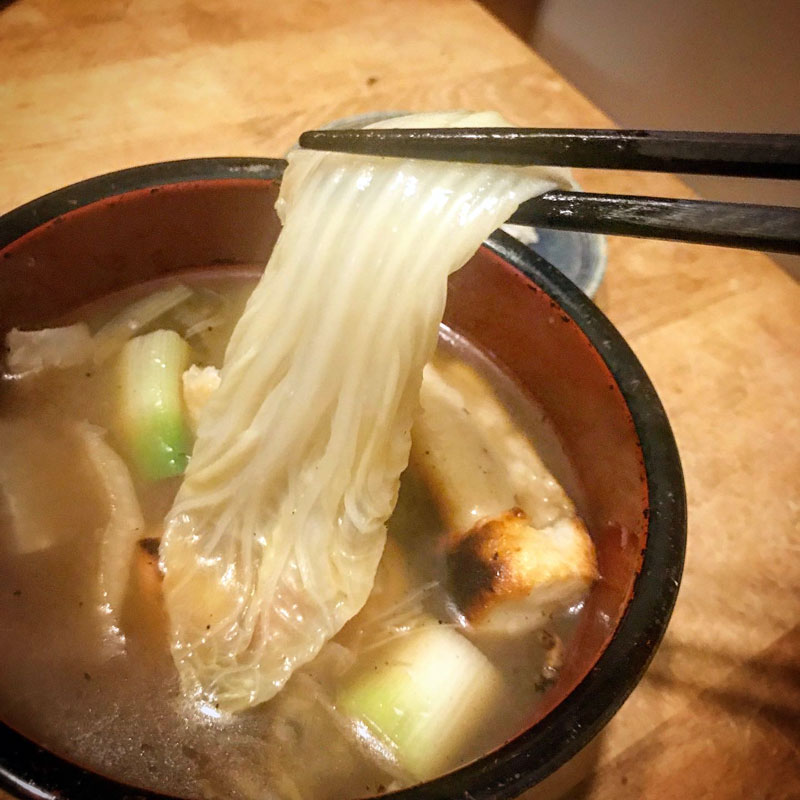 昨日のきりたんぽ鍋の残りに、きりたんぽと杵つき餅を焼いて入れて。下仁田ネギや