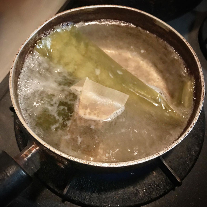 鍋の水に漬けておいた2種類の昆布に出汁パック入れて日にかけてる間に