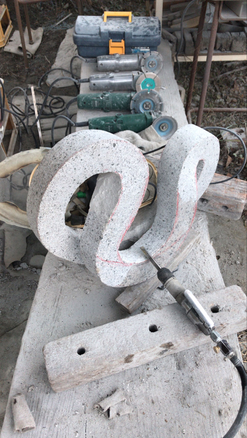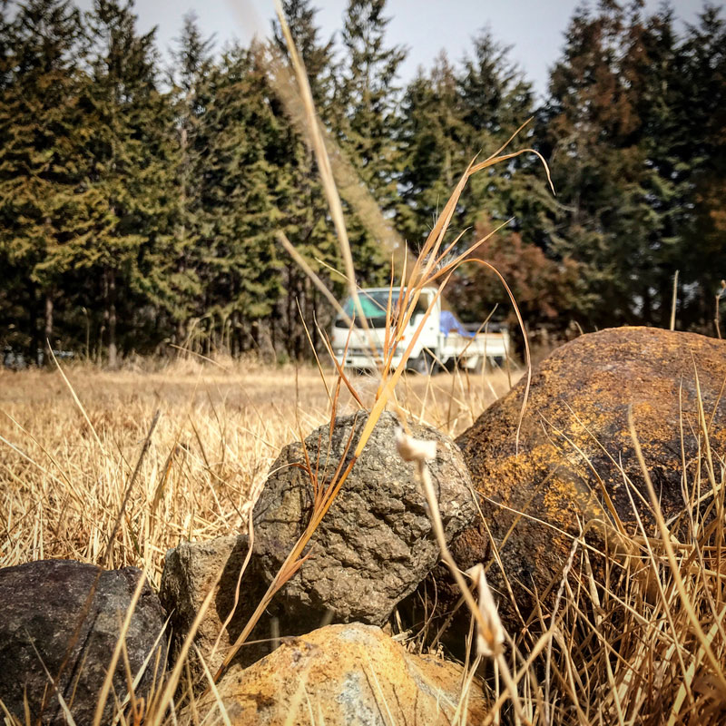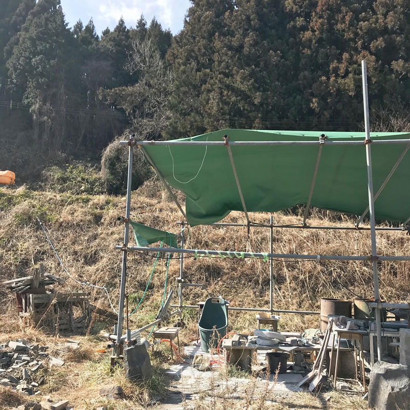 仕事場について、あれ?在庫の石の上に土が乗ってるなぁと思ってよく見たら猪にやられてた。