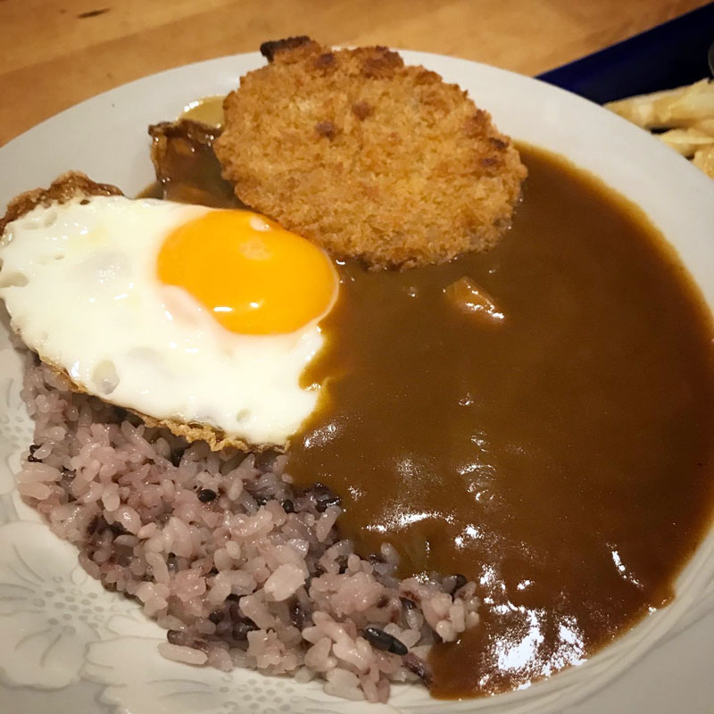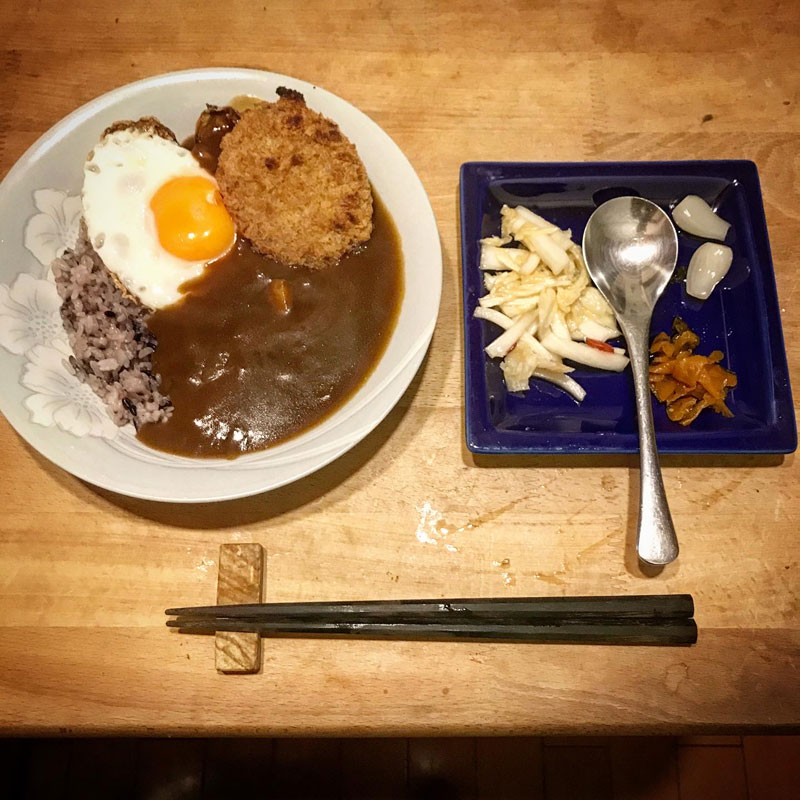 セブンイレブンのコロッケ、白身カリカリ目玉焼き、らっきょ、福神漬け、ラーパーツァイ。