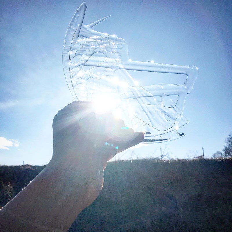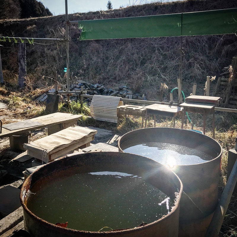 異常な冬の記録。今朝も仕事場のドラム缶の水は触った途端に溶けてしまうほどの薄氷が張っているだけ。