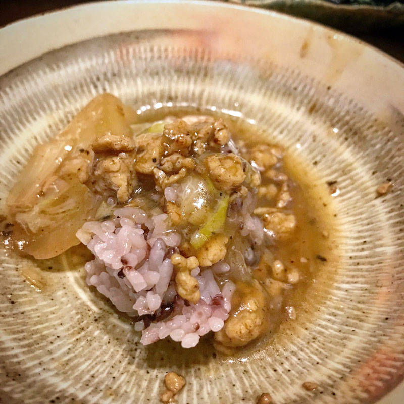 餡かけの中華はやっぱり on the ライスだねぇ。古代米(黒米)を混ぜて炊いたご飯に乗せて食べたら最高。赤い金麦が沁みる。