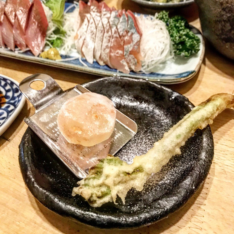 昨日いただいた初ものの山ウドの芽の天ぷらを擦った岩塩で。