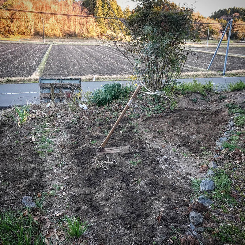 仕事終わりの夕方、畑の土を鍬で起こす。わずかなスペースしか無いけど美味しい食材で食卓を幸せにしてくれる庭の猫の額畑。