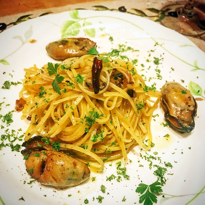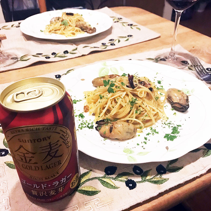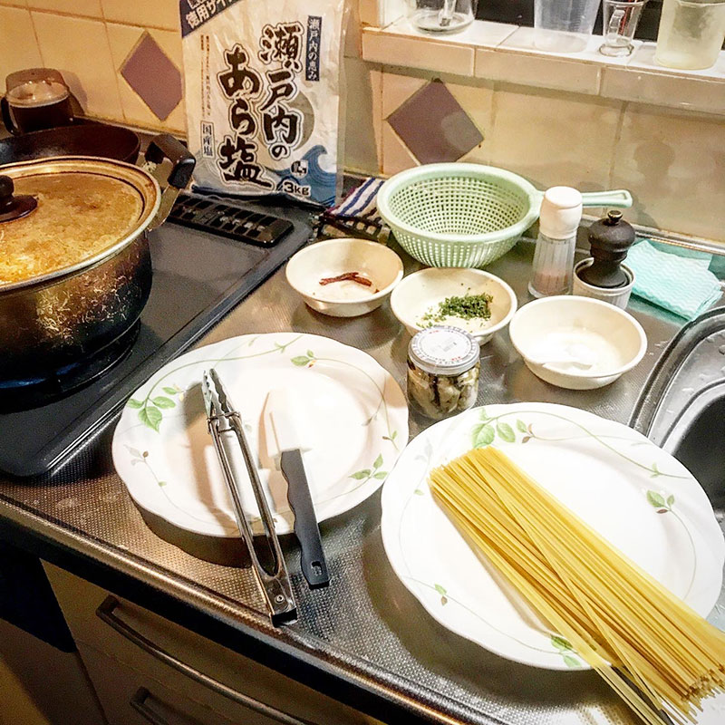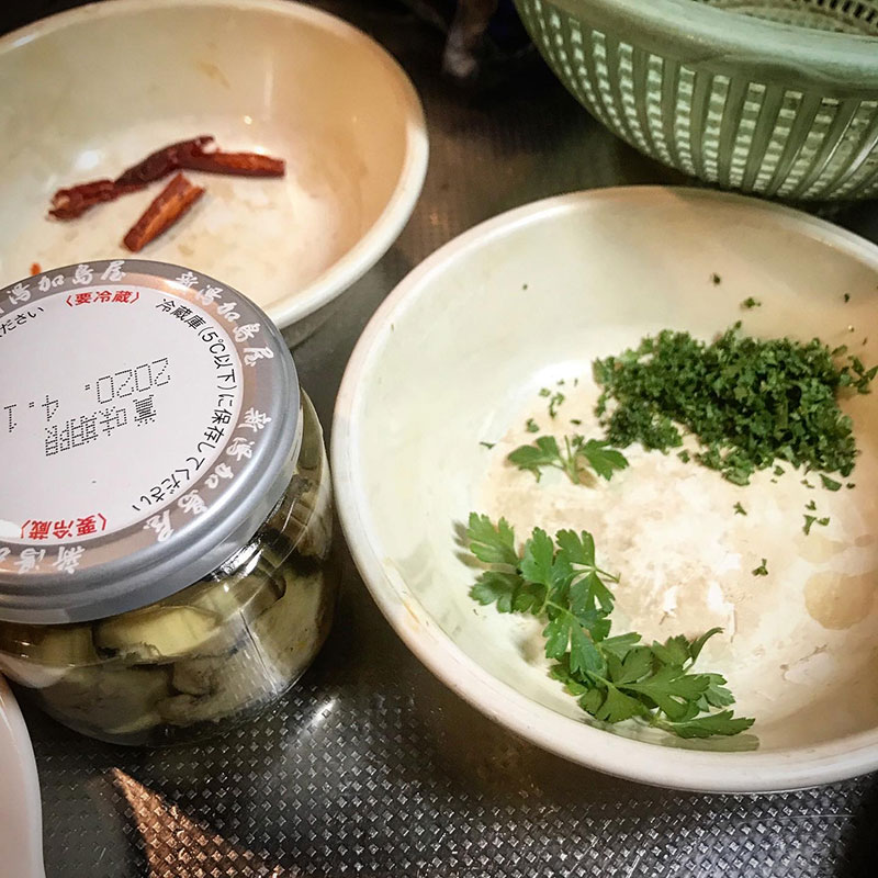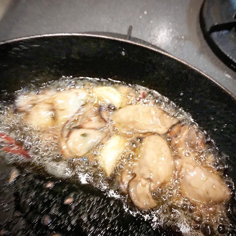 パスタを茹で始めたら牡蠣を漬けたオイルでニンニク、鷹の爪に