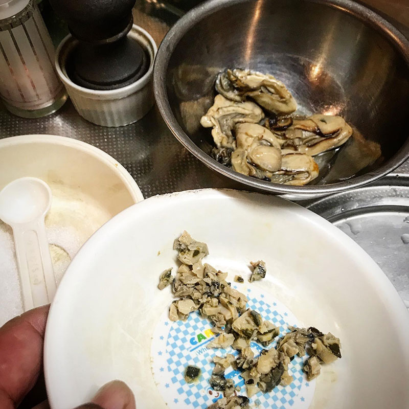 牡蠣のひとつをみじん切りにして残りはそのまま投入。