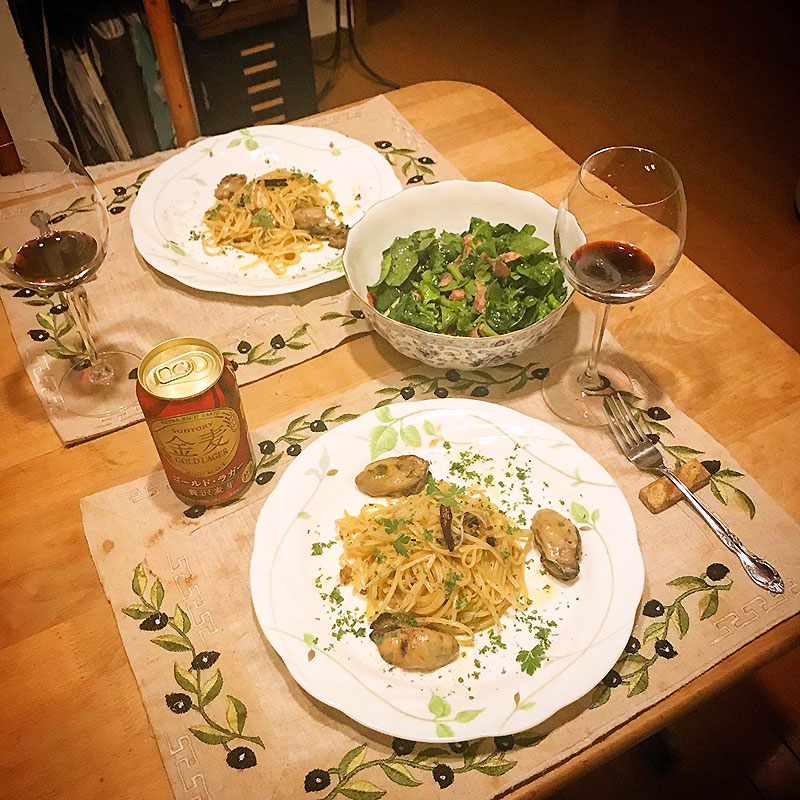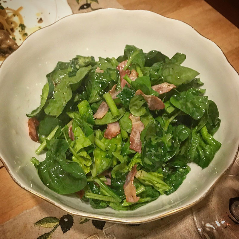 カミさんは近所の方に山盛りいただいた摘みたてのほうれん草てサラダ作ってくれた。ベーコン炒めたら熱々のオリーブオイルごとジュジュッと回しかけたら白ワインビネガーかけて、岩塩と黒粒胡椒をミルで挽きいれて混ぜて完成。調味料合わせてかけるんじゃなくでオイルやビネガーや調味料を別々に合わせるのが美味しいんだって。