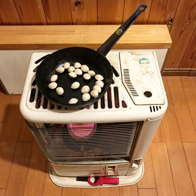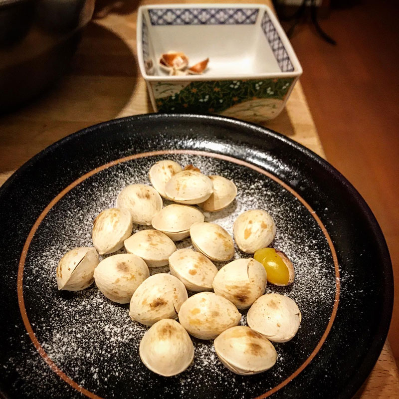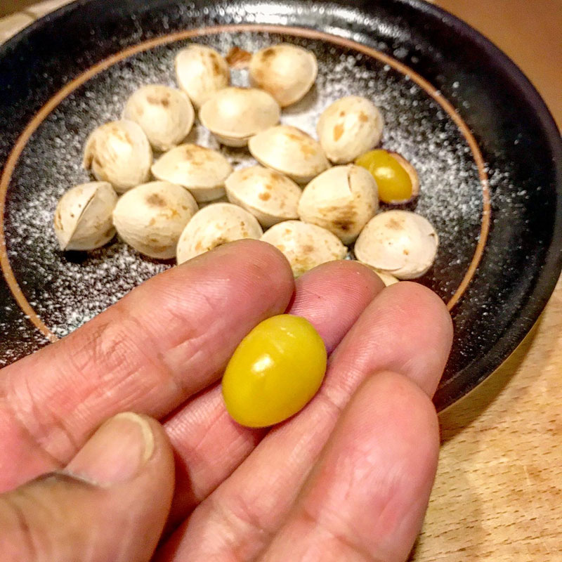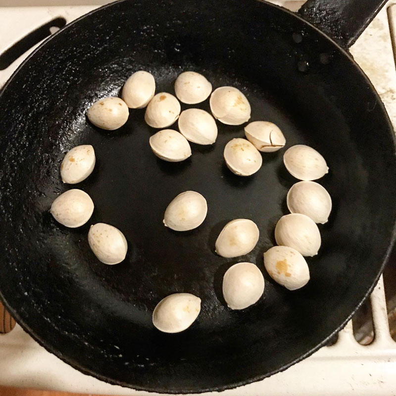 木槌で殻にヒビを入れて小さな鉄のフライパンで銀杏炒り。