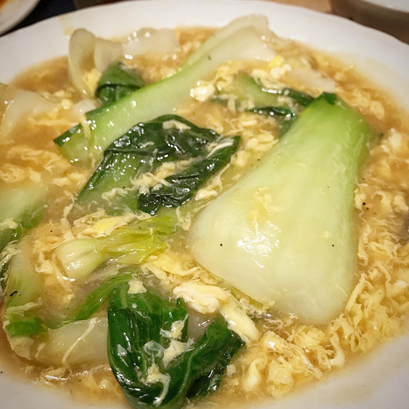 いつもはシンプルに炒めることが多いけど今宵はその上に卵も溶いた餡をかけた。青梗菜の茎はツルツルなので味が乗るように餡がかりにすると美味しい。