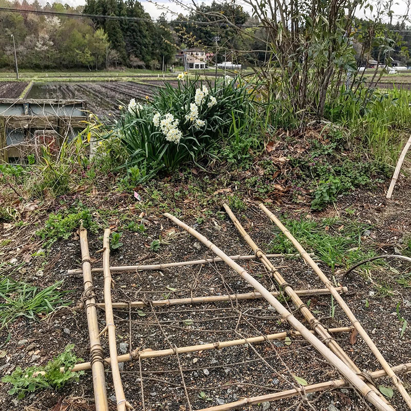 先日の嵐で倒されたきゅうり棚。忙しくて直す暇がない。