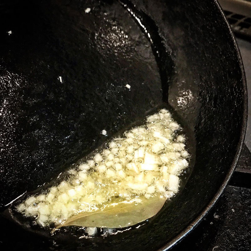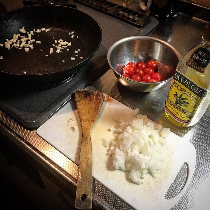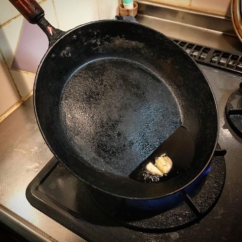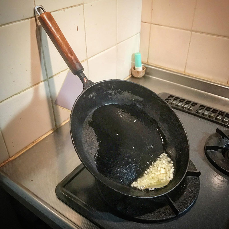 フライパンでオルーブオイルにニンニクの香りを写す。