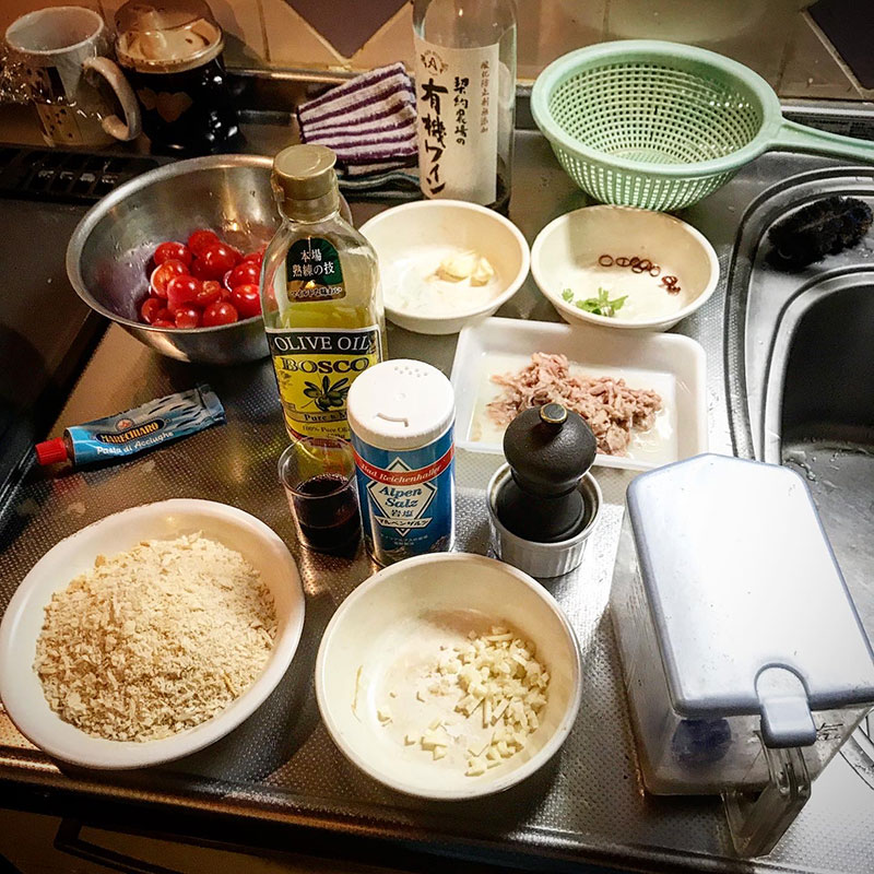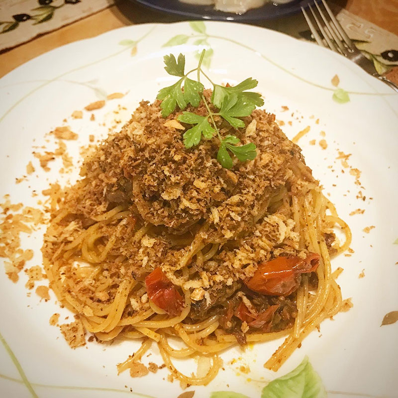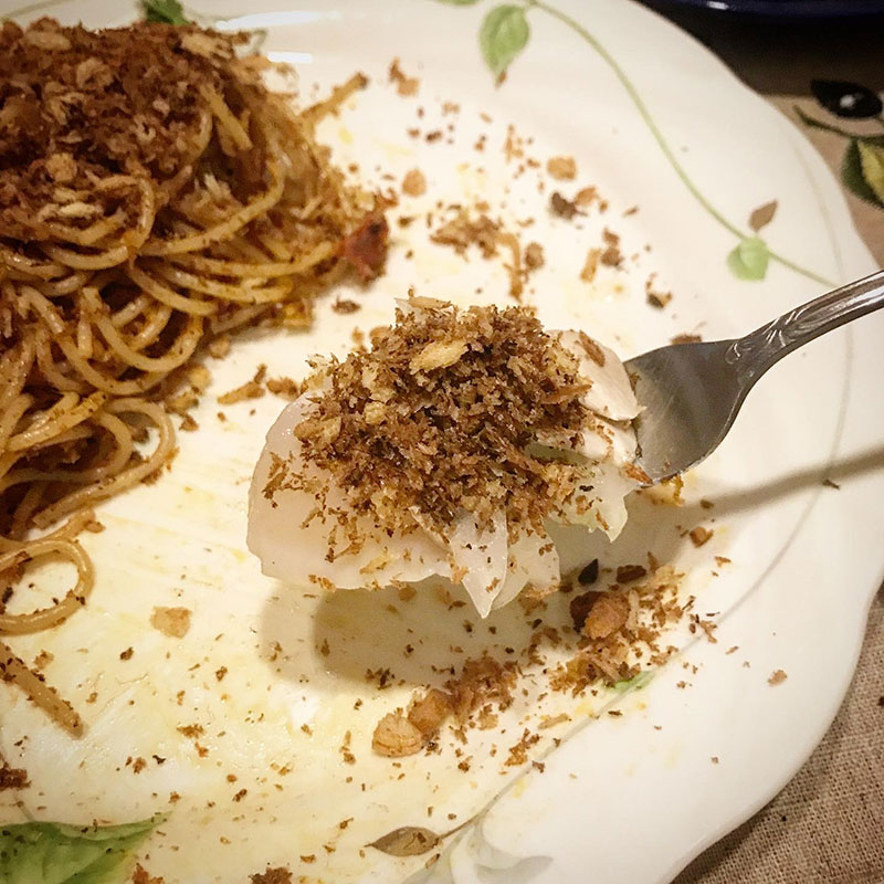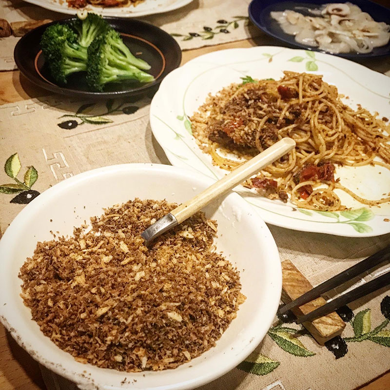 南イタリアの家庭は貧しい人が多いからパスタにチーズをかけられないのでこのニンニクパン粉をかけるんだって。香ばしいし腹持ちもするし。美味しい。