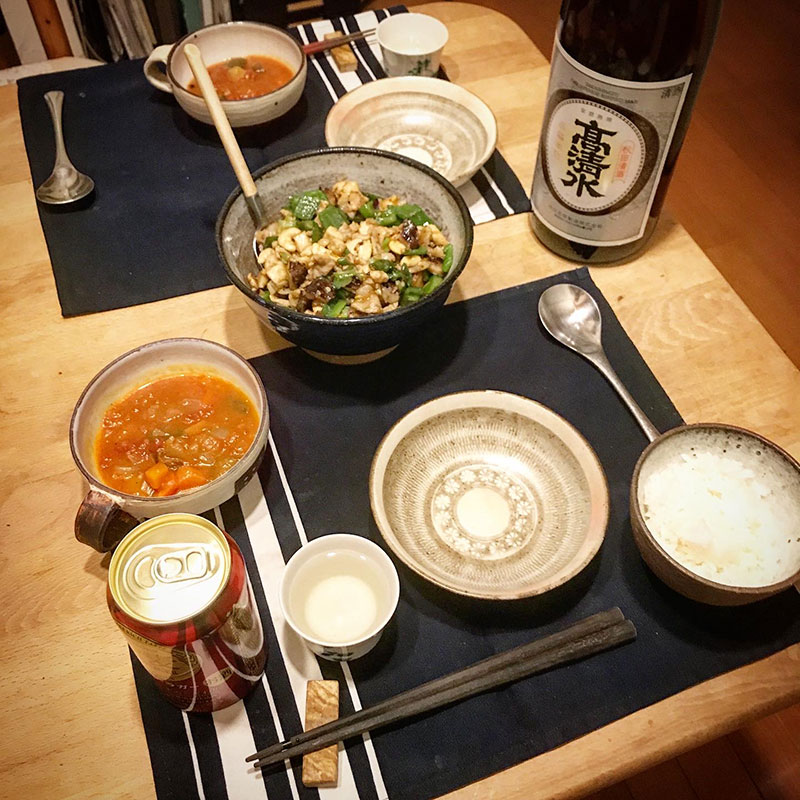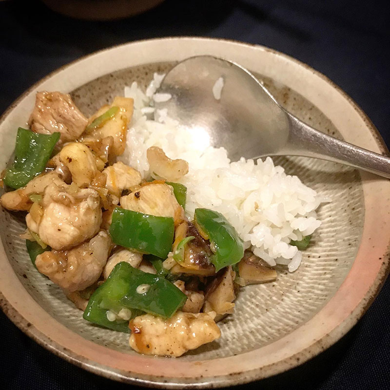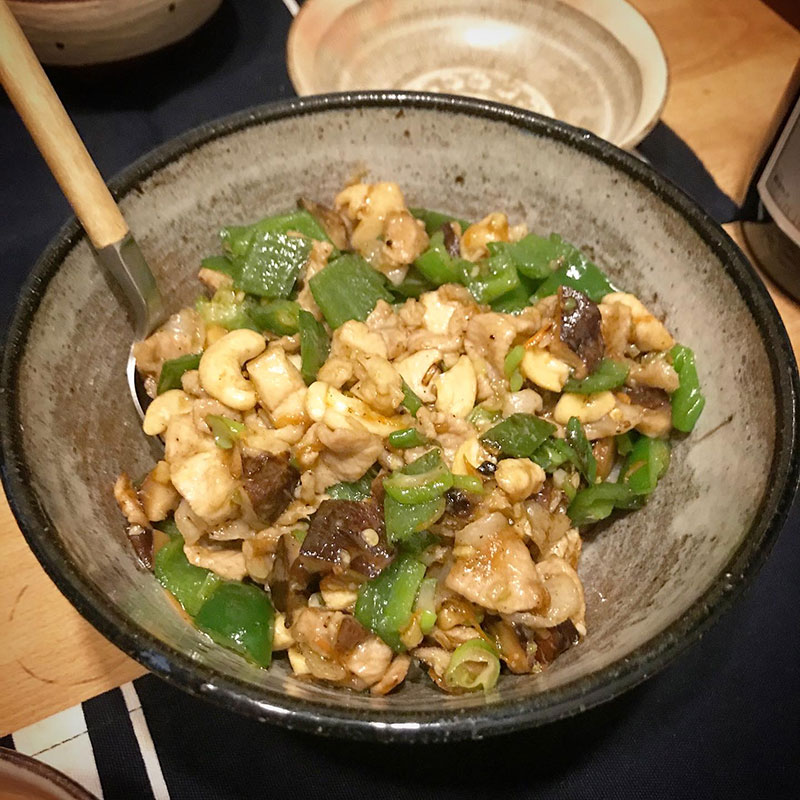 居酒屋我家、開店。鳥と豚のカシューナッツ炒め、作った。