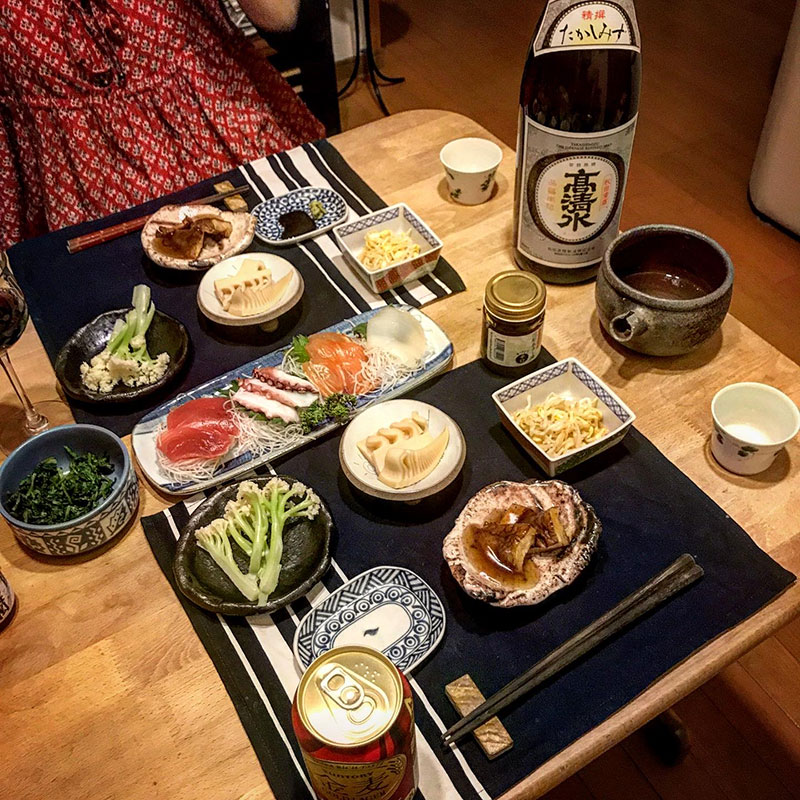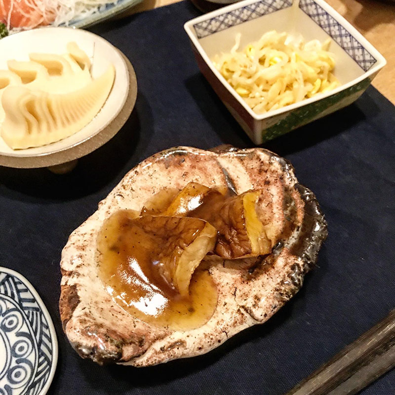 居間で育ててる椎茸を素揚げしてかえしとすし酢と片栗粉で作った餡で。刺身。カリフローレ。山形の竹の子。