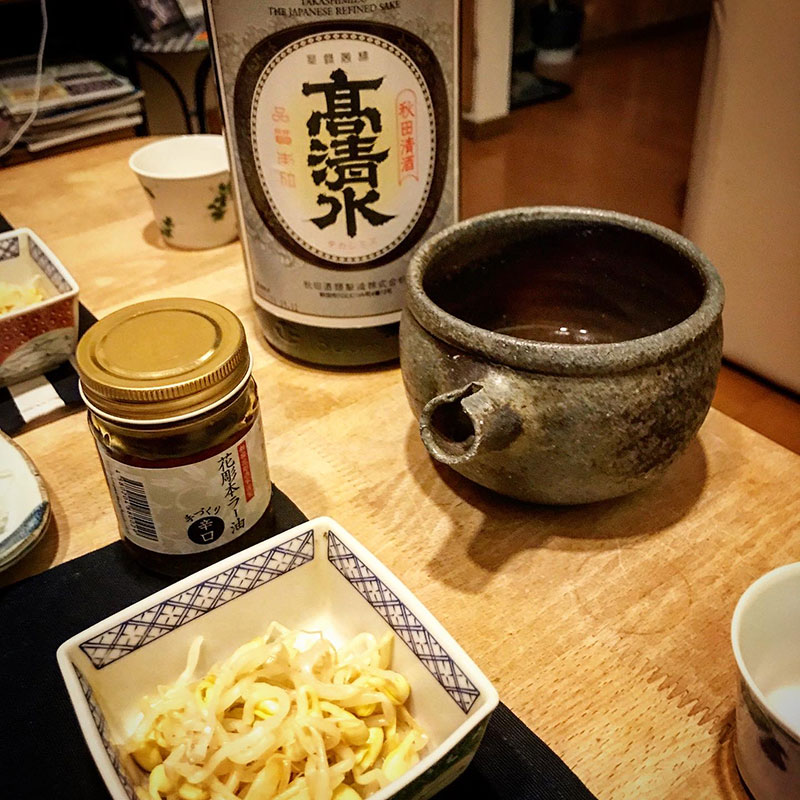 豆もやしに花掘本ラー油かけて。