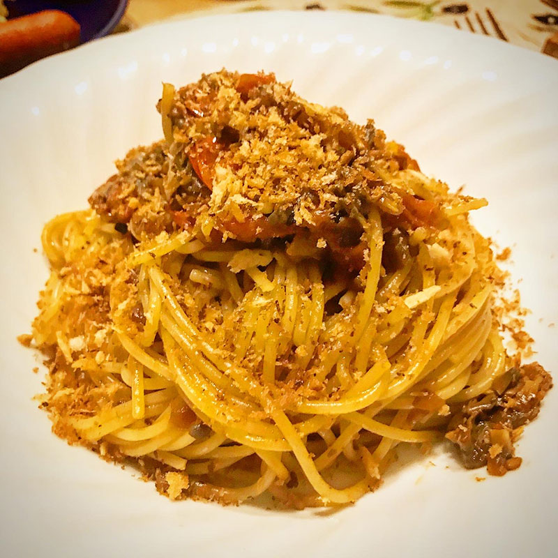 ミニトマトとマッシュルームのパスタ。南イタリアのレシピでにんにくパン粉かけて。
