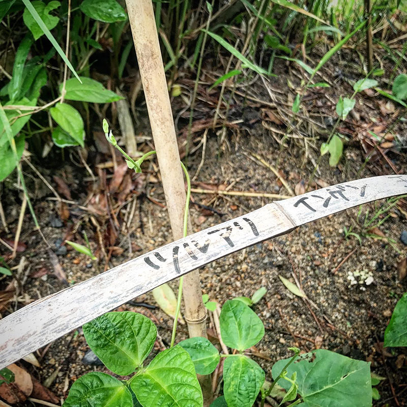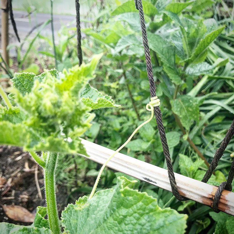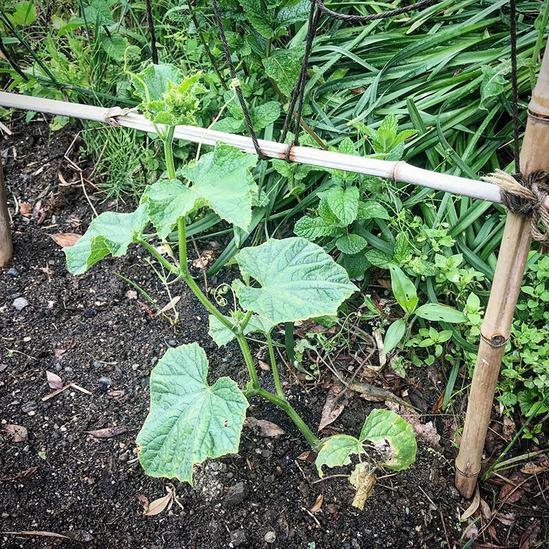 友だちのお百科さんにもらったつるありインゲン王湖もきゅうりに続いて蔓を巻き始めた。自家採種できるので大切に育てる。
