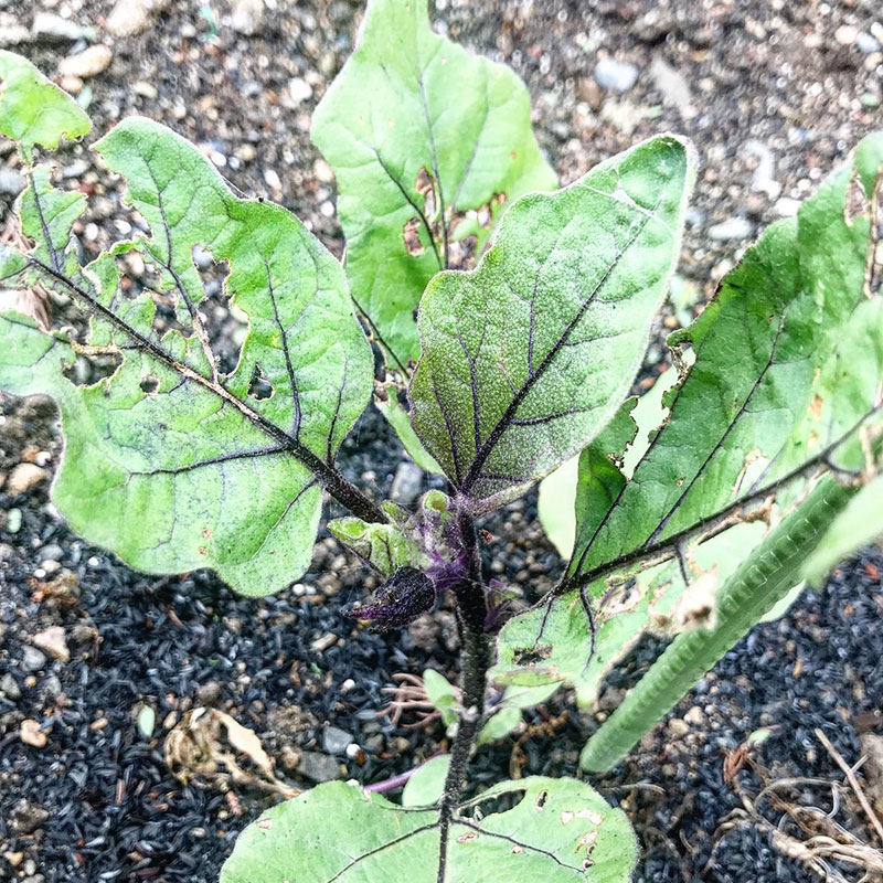 ナスの葉がてんとう虫に食べられまくって穴だらけ。