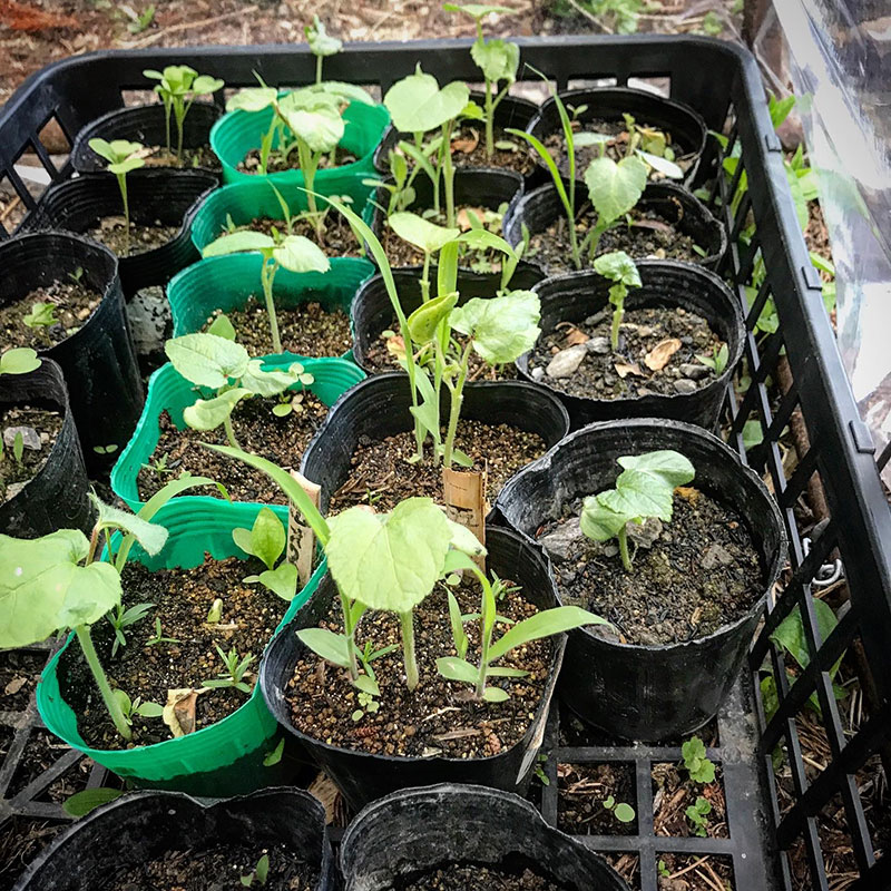 定植を待つオクラ。友だちのお百科さんにもらった島おくらと五角おくら。本葉5枚位になるまでもう少しこのミニハウスで。