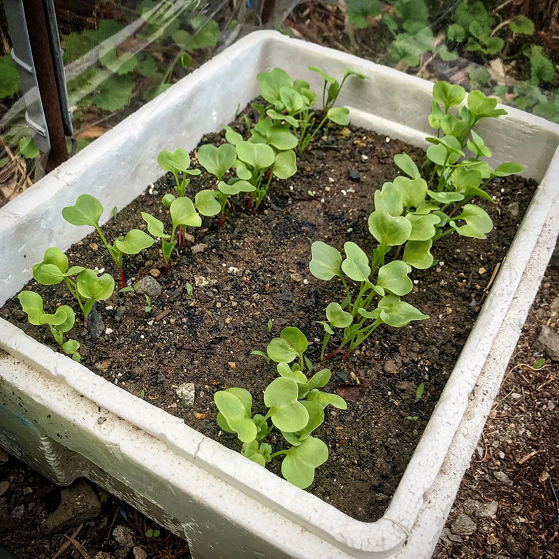 間引いたものはもちろんいただきます。かいわれ大根だけじゃなくてこれも普通に美味しい。先日は間引いた大根も畑でいただきました。美味しい、美味しい。