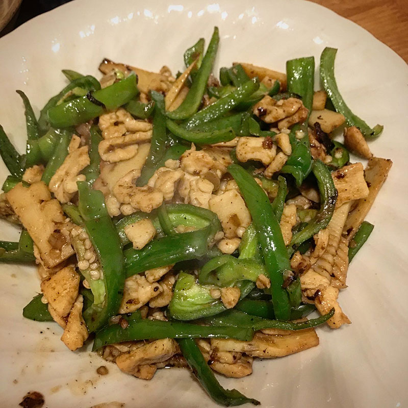 鶏肉で青椒肉絲作った。三重の竹の子も入れて。