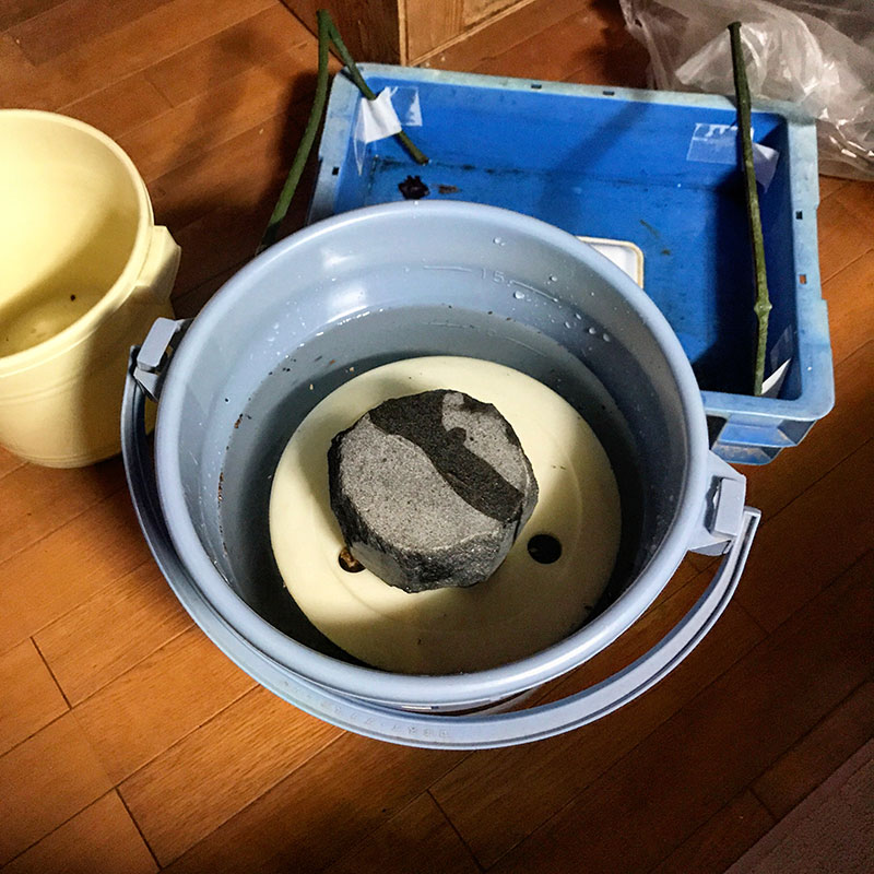 夕食用に4つのしいたけ収穫して3回目の収穫に向けて菌床を冷水に浸水させる。