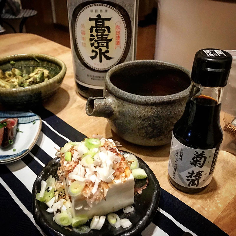 ついこの間湯豆腐食べてたのに暑くて冷奴。鰹のタタキは秋田の日本酒、高清水で。