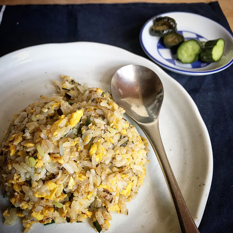 昼飯に炒飯作った。庭のニラと卵ふたつ入れてニラ玉 炒飯。