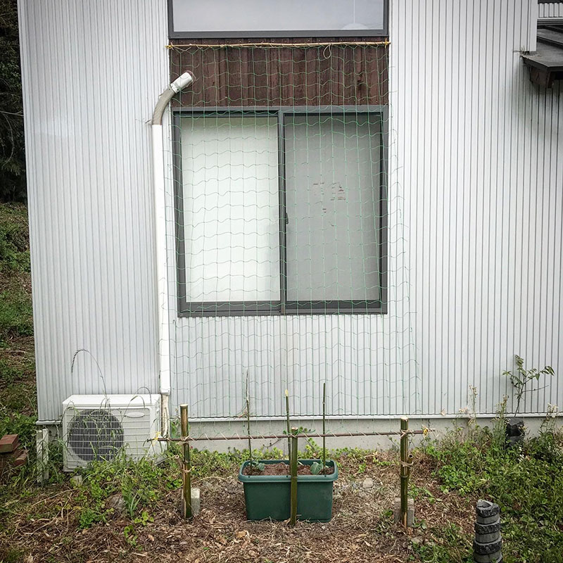 カミさんの音楽教室の大きな窓に毎年夏は日除けを設置している。(10年前に一度失敗してるけど)今年は緑のカーテンに挑戦しようとゴーヤを植えた。ただ、この場所は屋根からの雨が落ちるところで原発事故の際放射能を測定したら我が家の庭の中でも特に放射線値が高いホットスポットだった。大きく穴を掘って安全な土と入れ替えて植えたけど