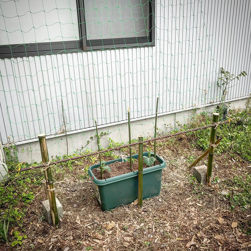 ゴーヤひとつ、きゅうりふたつ苗を定植。ネットも設置した。