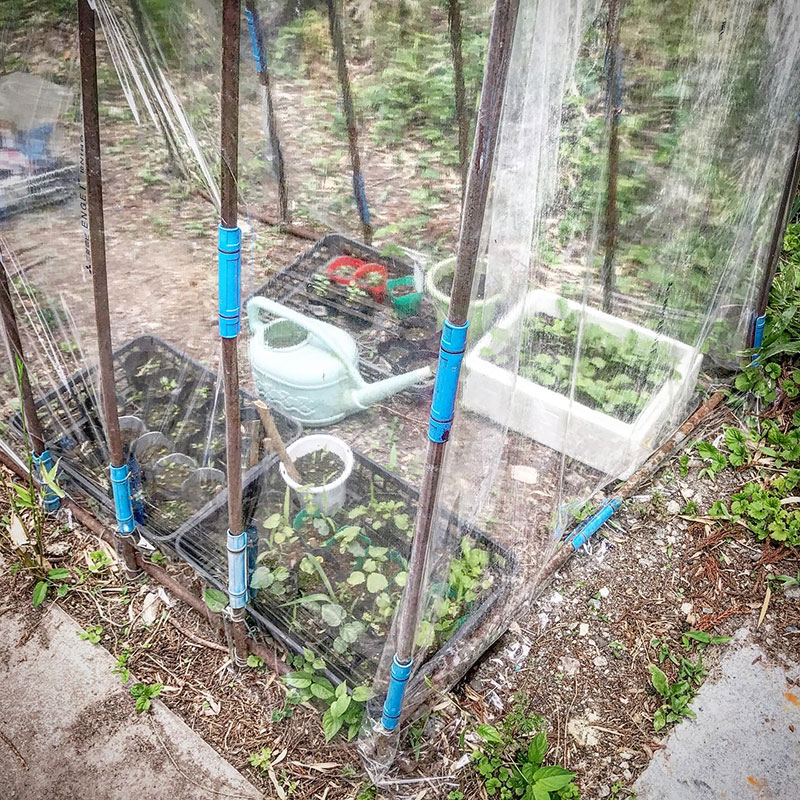 定植できる本葉5〜6枚になるまでミニハウスで育てているオクラ2種他。