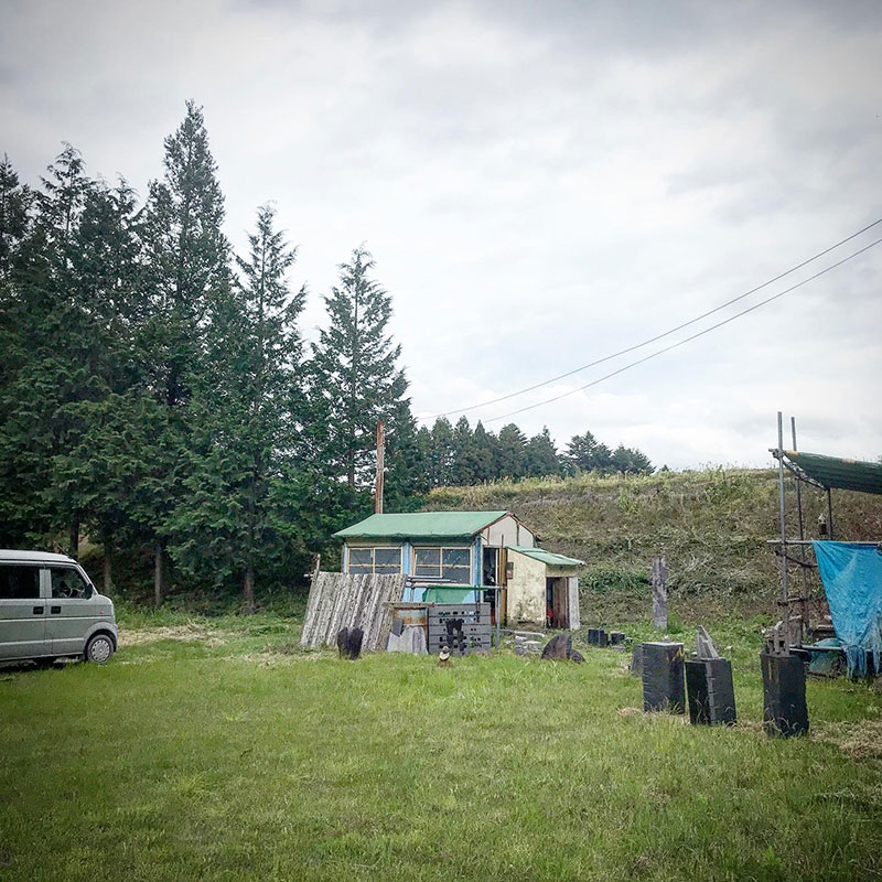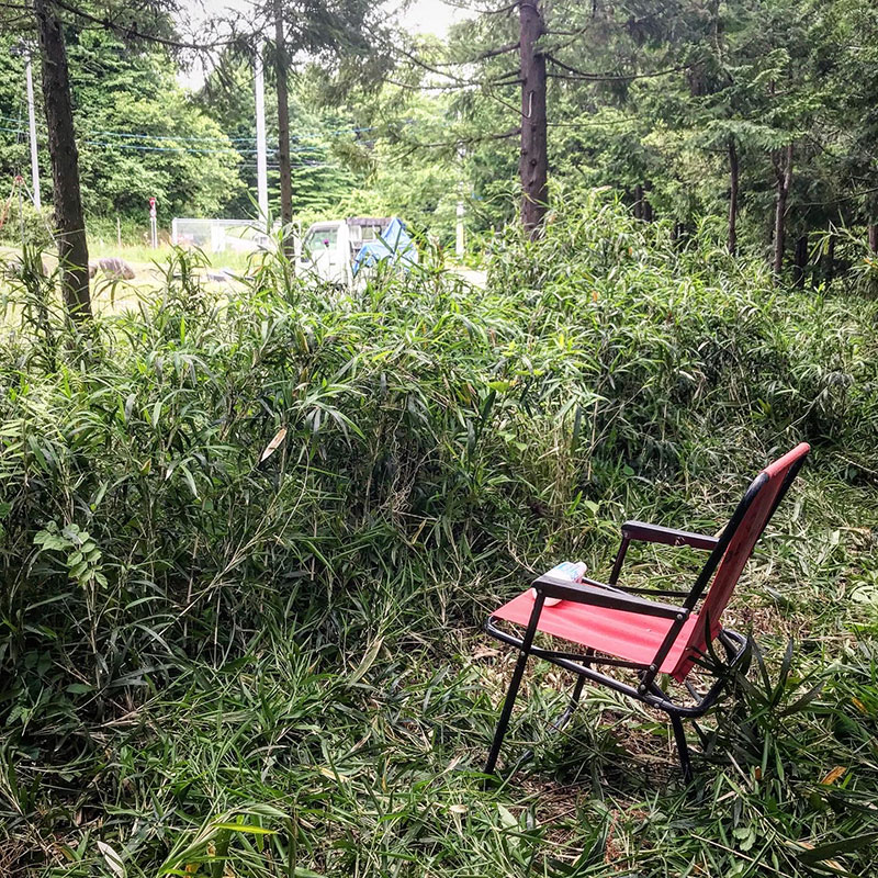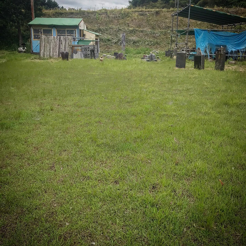以前はぬかるみがちで所々に低木も生えほとんど苔に覆われていた仕事場。毎年草刈りを続けていたら野芝が勝手に生えて今ではよく管理されたゴルフ場の様になった。