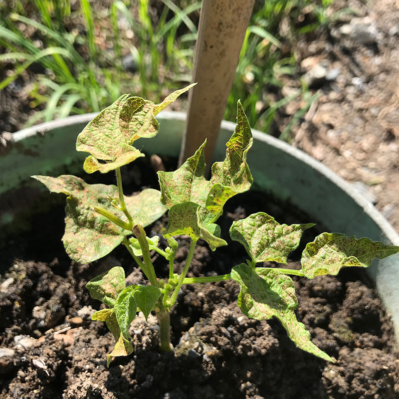 緑のカーテンに参加させようと思っているインゲン。葉が茶色に痛んでる。アブラムシが運んで来たウイルスか。とりあえず一番日光の当たるところに移動して干す。