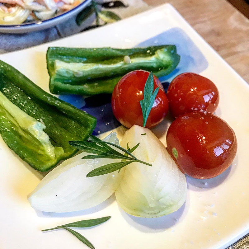 瞬間蒸し野菜。三浦さんの美味しいミニトマトが美味しさ倍増。