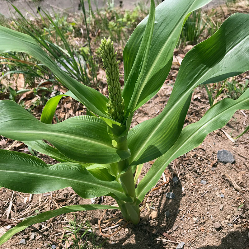 朝の畑の見回り。こんな低いのに穂が出てしまったとうもろこし。