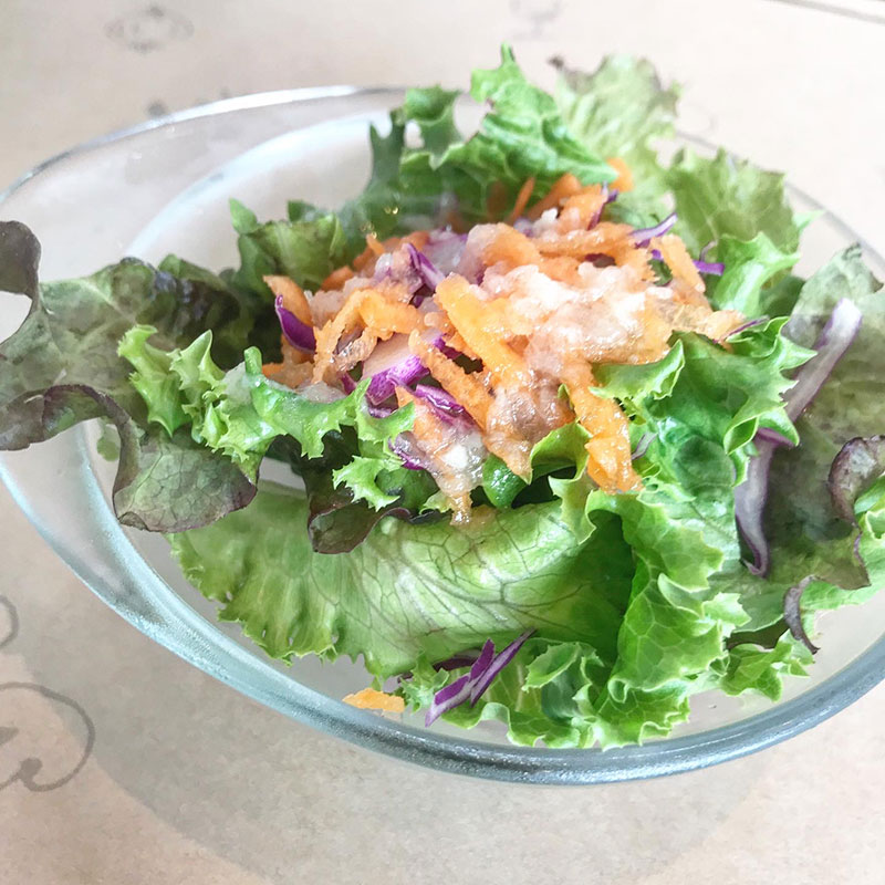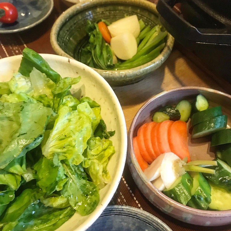 三田農園のサラダ菜と庭の畑のルッコラのサラダ。きゅうり、にんじん、カブのぬか漬け。