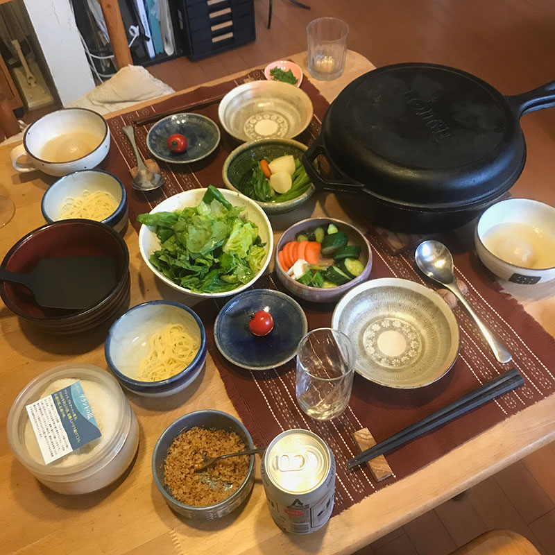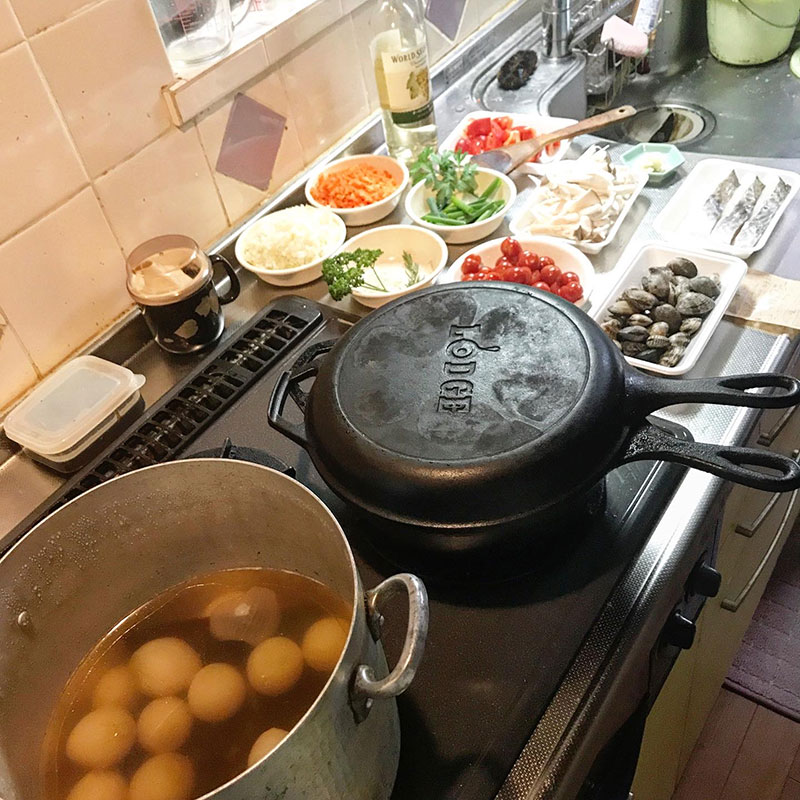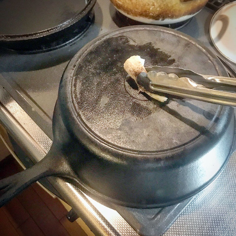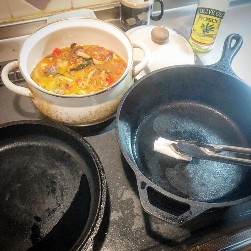鍋を鉄のダッチオーブンやスキレットにするだけで美味しさ倍増なんだけど、そのままにすると錆びてしまう。酔っ払う前にホウロウの鍋に中身を移してスキレットのメンテナンスをすぐに。たわしで水洗いして空焚きしてキッチンペーパーでオリーブオイルを全面に塗っておく。