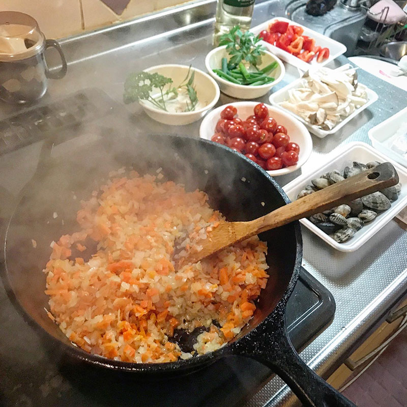 オリーブオイルにニンニクの香り移したら玉ねぎを炒めにんじんも。