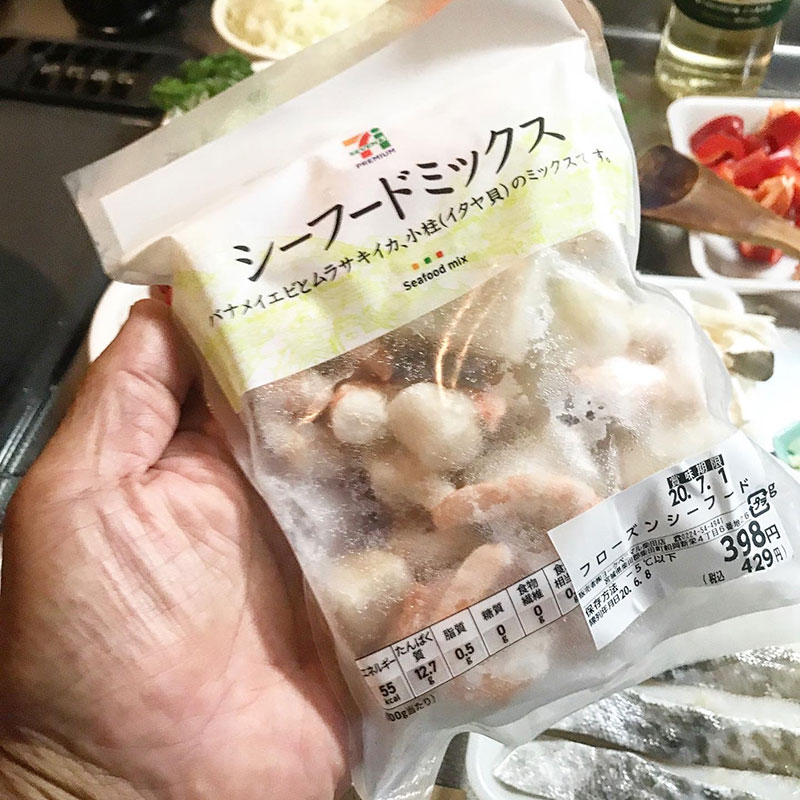 玉ねぎが飴色になったところで白ワイン、そしてちょっと手抜きのシーフードミックス投入。