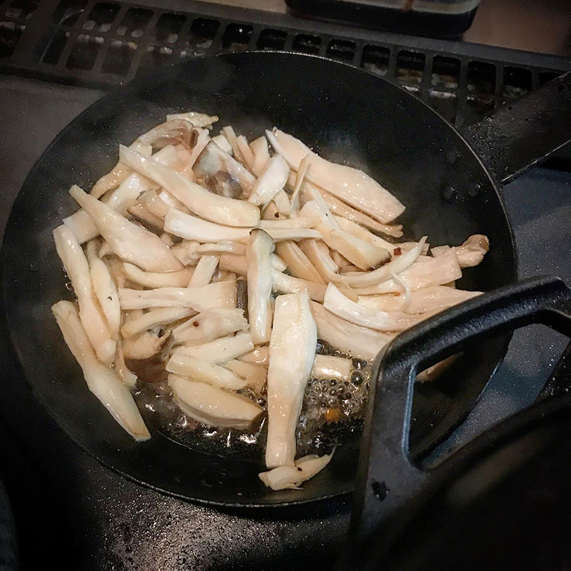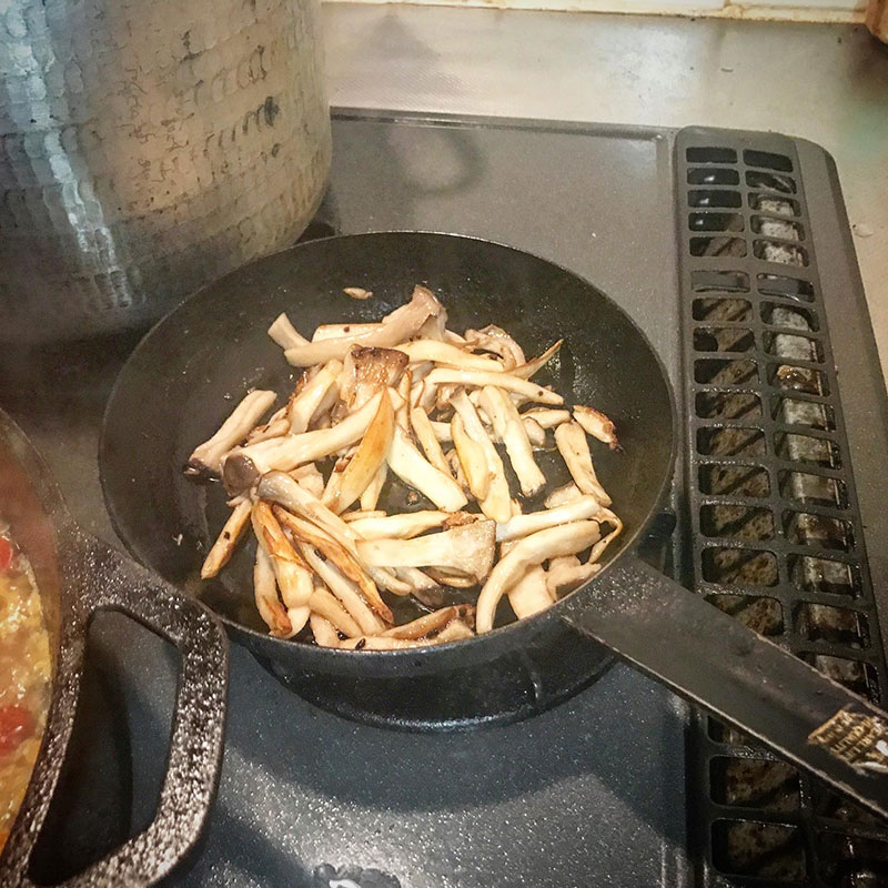 エリンギは最初水が出て更に炒め続けて体積が1/3くらいになって水も飛んで焦げ目がつき始めたらスキレットに投入。