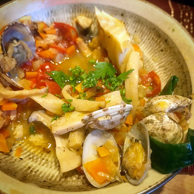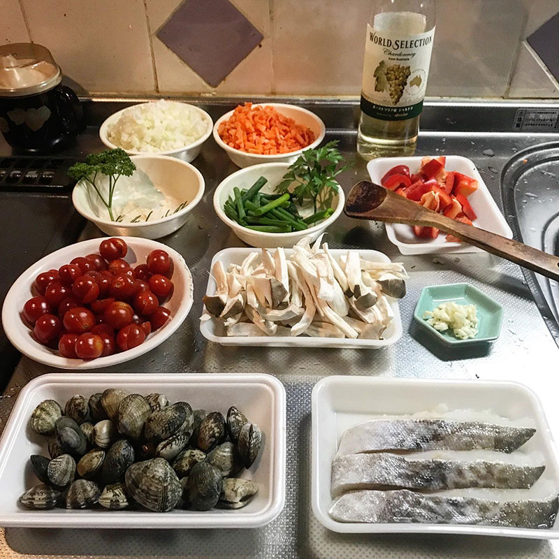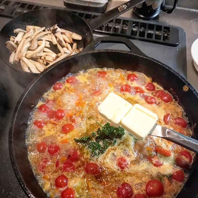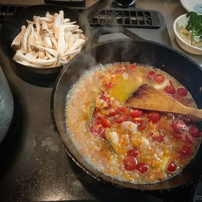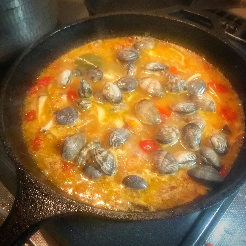 ロッジのスキレットで作ったブイヤベース。蓋の噛み合わせの精度が高いので圧力鍋の様に蒸し焼きしてくれるから普通の鍋より断然美味しくなる。やっぱ鉄だな。