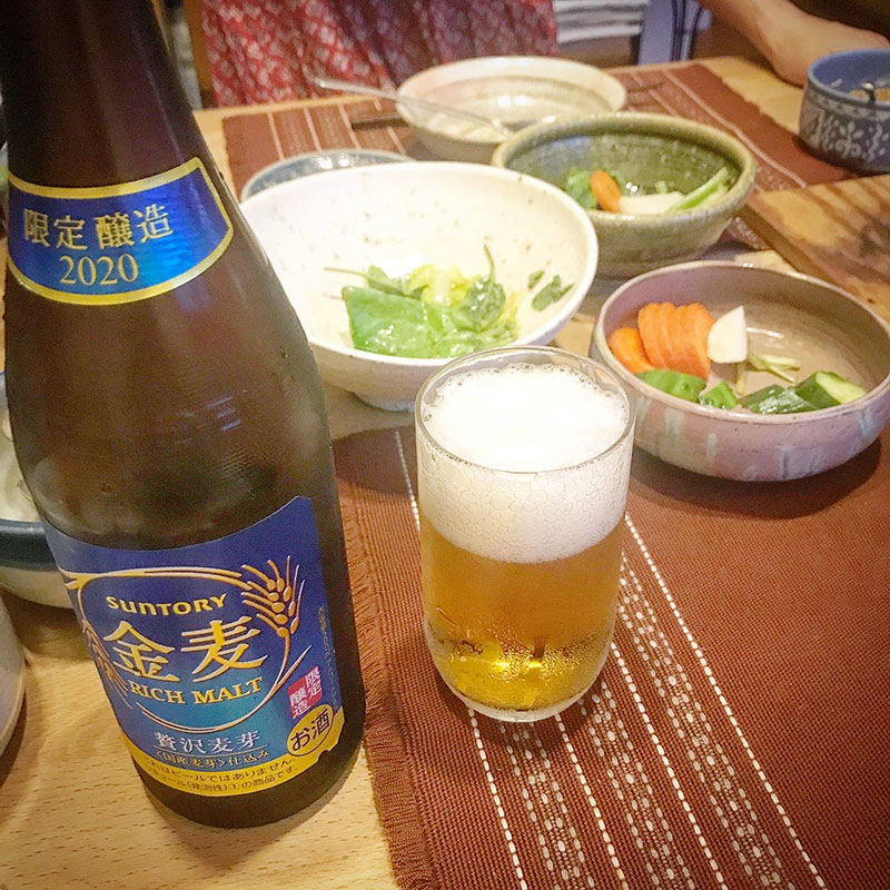 いただいたスーパードライで乾杯。2杯目は金麦のポイントシールを集めてもらった非売品の限定醸造瓶詰め金麦。